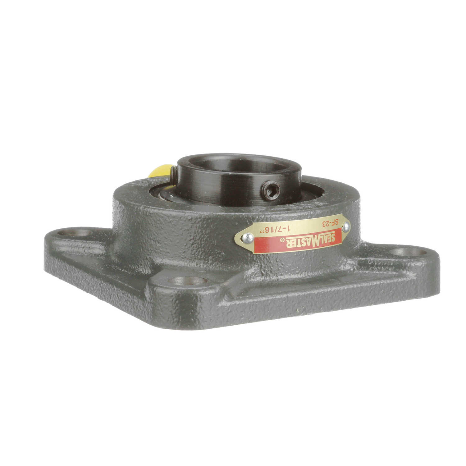 Flange Block Bearing; 4 Bolt Square Flange Block; 1-7/16" Bore; 5.1" Bolt Circle Diameter; 3-5/8" Bolt Spacing; 1 Piece Solid; Set Screw; Cast Iron; Ball Bearing; Relubricatable; Felt Seal