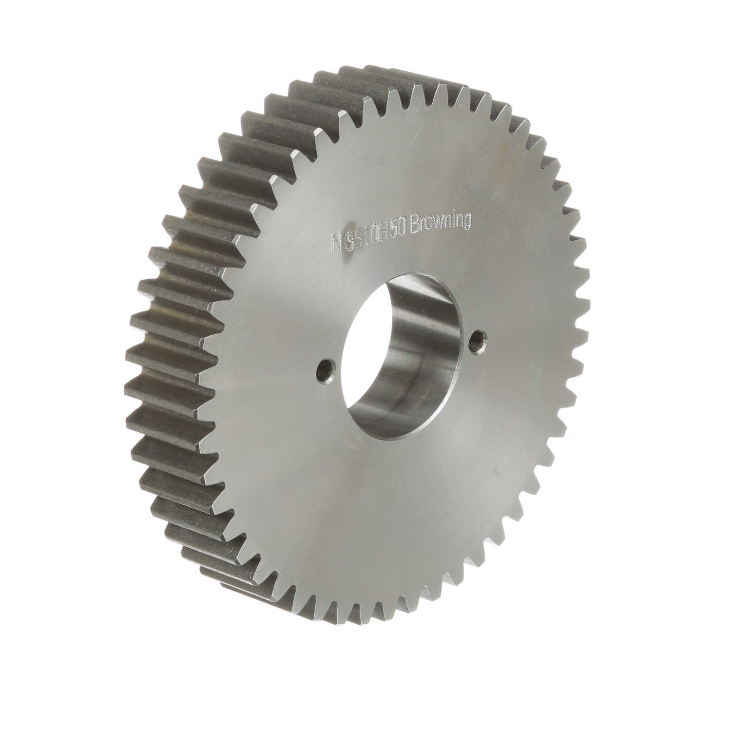 Spur Gear; 5" Pitch Diameter; 10 DP; 1" Face Width; Bushed; 50 Teeth; 14.5 Pressure Angle; H; 3/8 To 1-1/2" Bushing Bore Range; No Minimum Plain Bore; 2-1/2" Hub Diameter; Steel; No Hardened Teeth