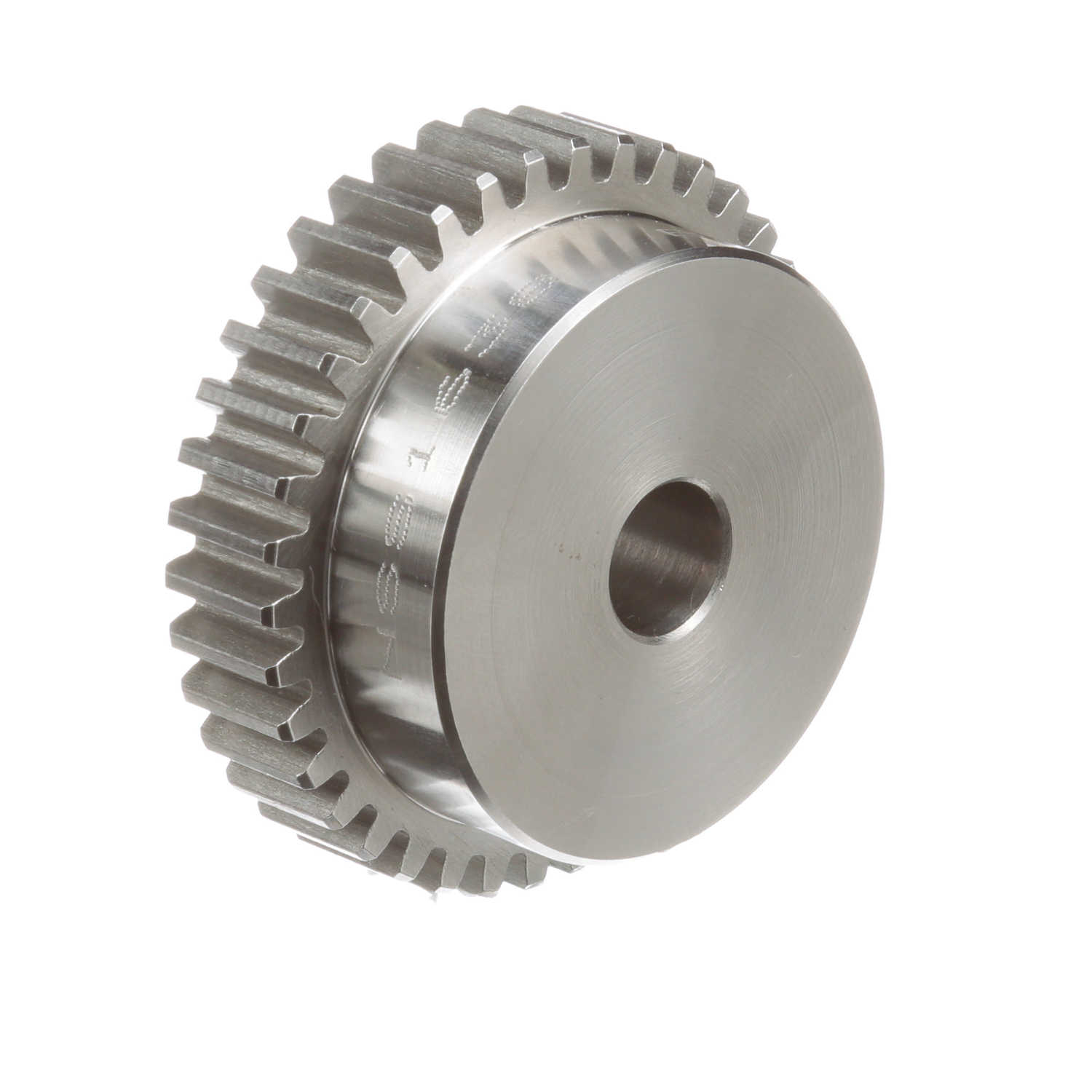 Spur Gear; 2-3/8" Pitch Diameter; 16 DP; 1/2" Face Width; Rough Bore; 38 Teeth; 14.5 Pressure Angle; No Bushing; Minimum Plain Bore; 1.25" Max Bore; 2" Hub Diameter; Steel; No Hardened Teeth